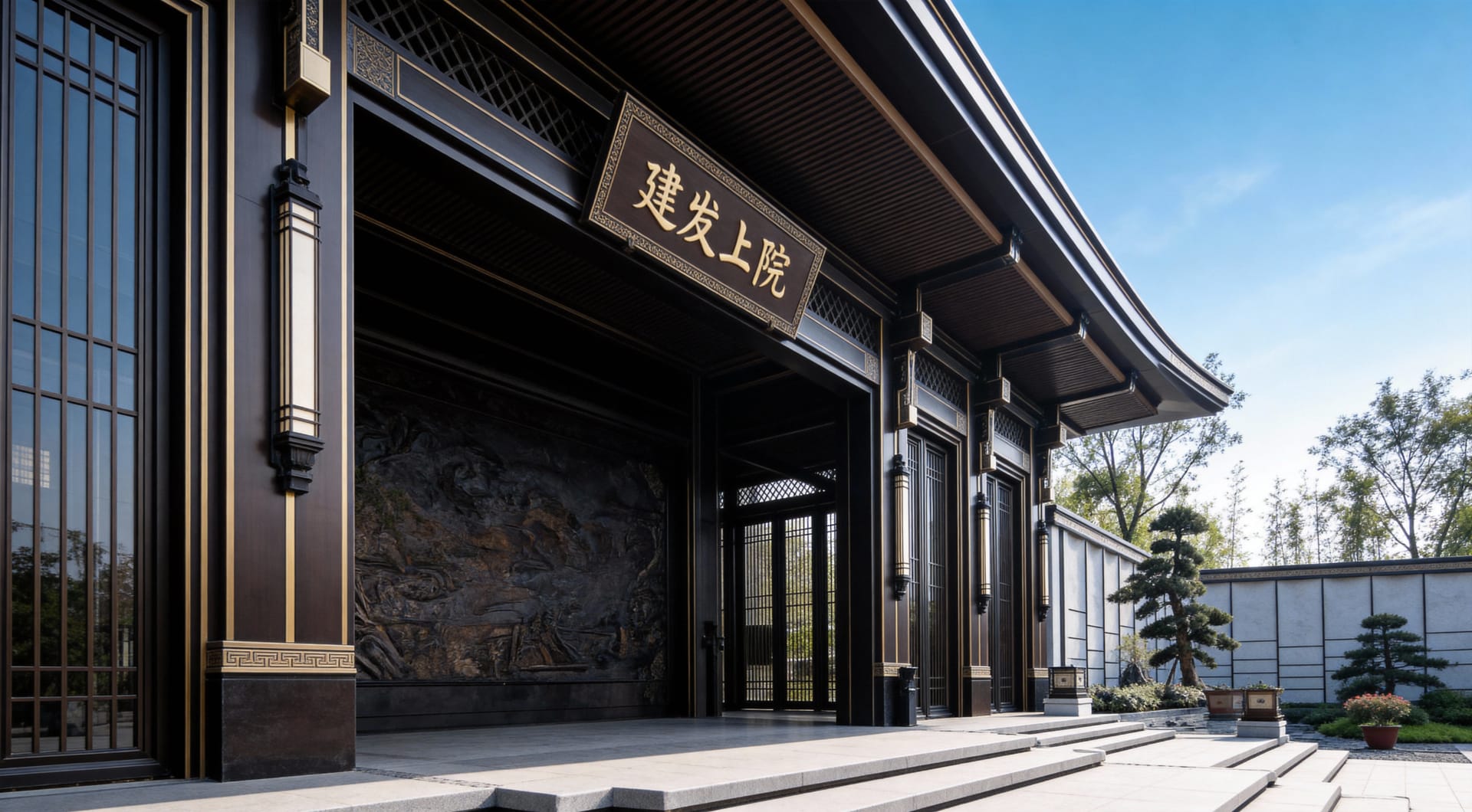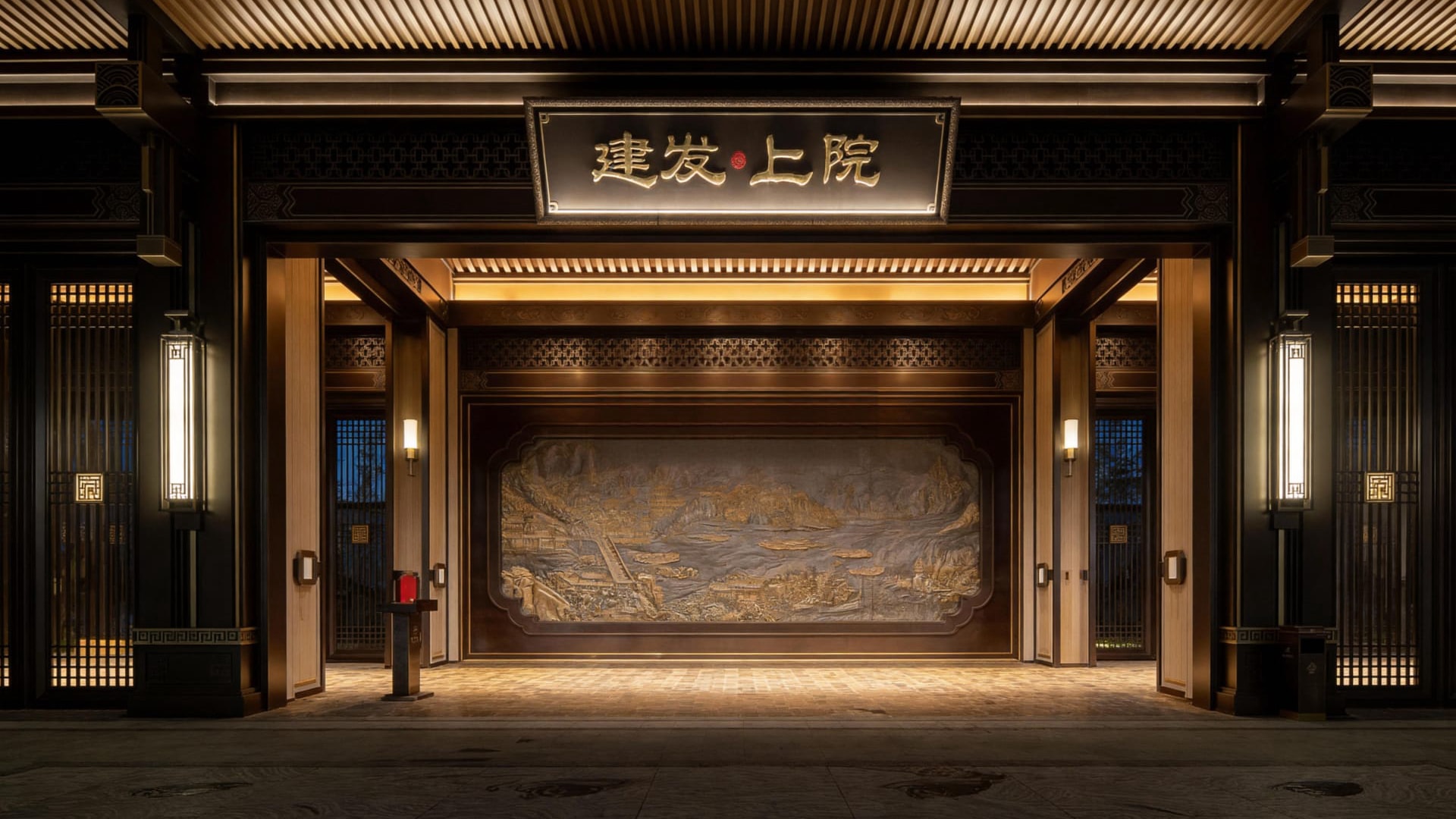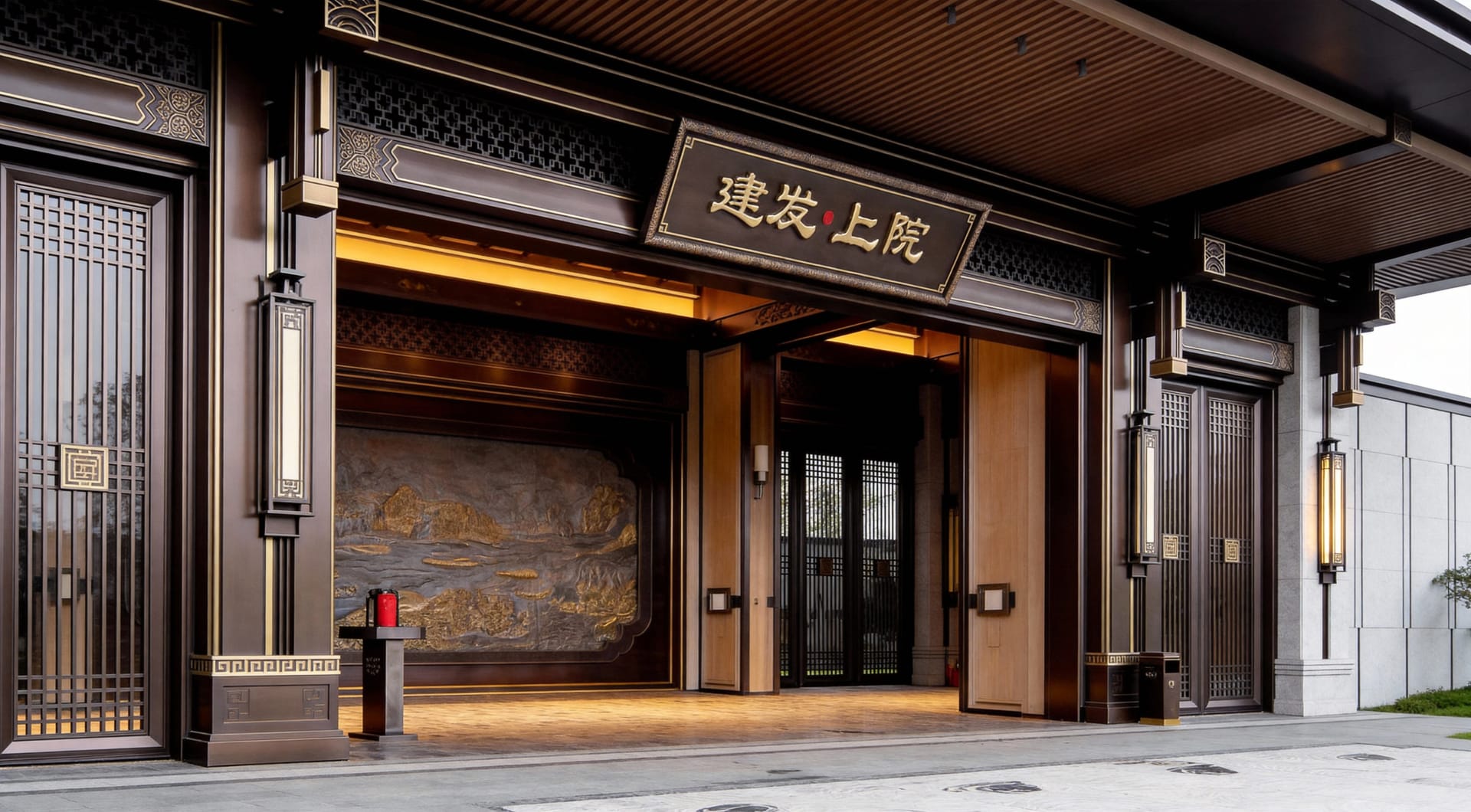 The Main Entrance Project of C&D·Upper Courtyard is led by the C&D Properties Design Team for its New Chinese style positioning, with the ODE Design Team responsible for the design. Leveraging our years of integrated design and construction capabilities in the decoration field, as well as our profound heritage and expressive strength rooted in Eastern culture, we undertook the detailed design and implementation of the entrance gates in this area. Taking the “gate-hall system” of traditional Chinese courtyard houses as the blueprint, we reconstructed core components such as the main gate and overhanging eaves using modern metal materials, integrated traditional Chinese decorative patterns, and presented the canal culture-themed scene via forged copper reliefs. Through the interplay of solid and hollow metal components and layered lighting, we preserved the ritual charm of traditional architecture while endowing the space with an elegant vibe favored by contemporary tastes.