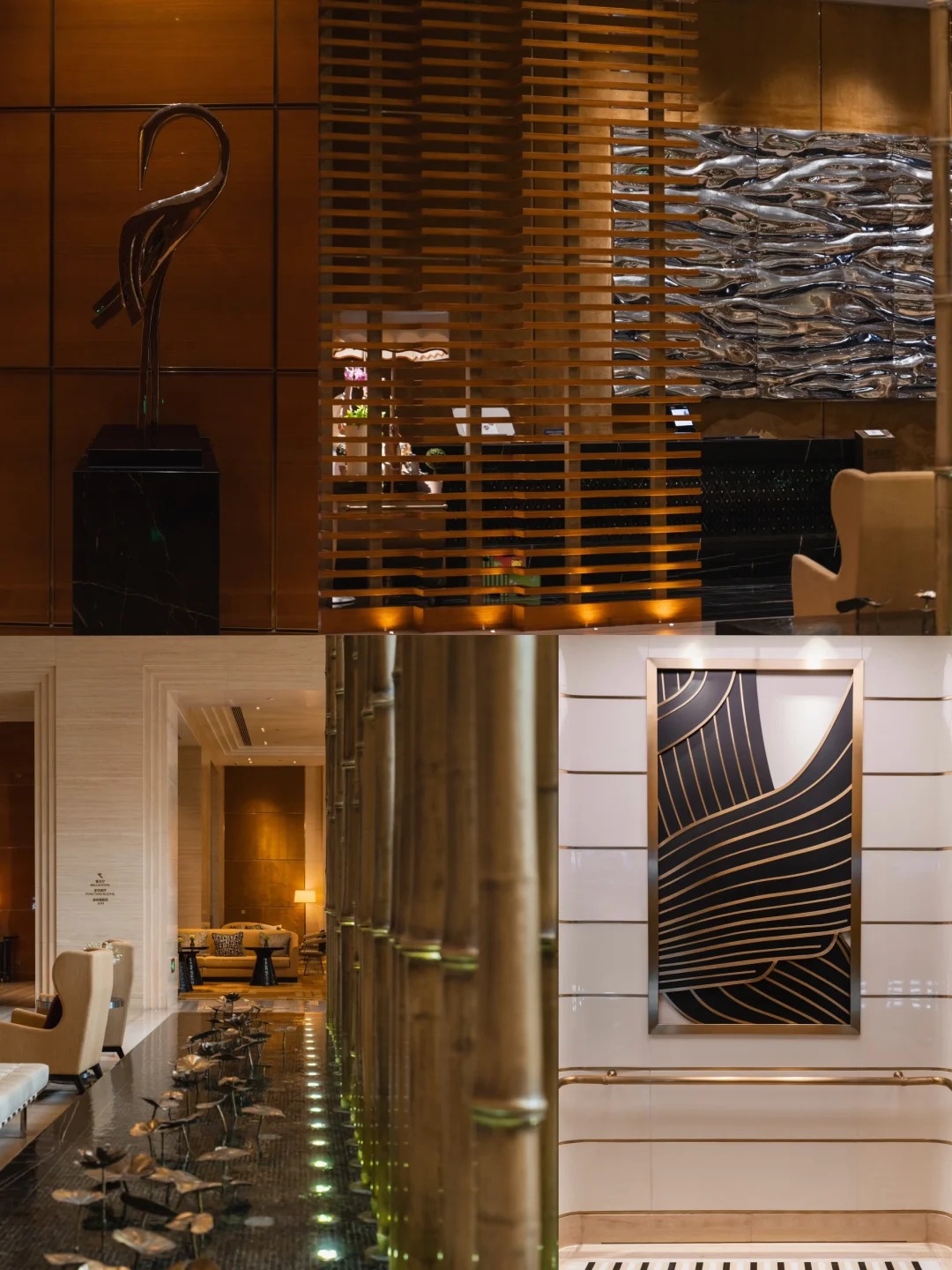 As a benchmark project of the Four Seasons brand in North China, Four Seasons Hotel Tianjin is co-designed by renowned international teams including WATG (USA) and PYR (France). It blends the Art Deco style with the cultural heritage of Tianjin. Our team undertook the detailed design, fabrication and installation of the hotel’s metal art decorations and artistic ornaments, which have become a core highlight elevating the high-end tone of the space. Using red copper and brass as base materials, we created a series of works including antique brass grille partitions, copper art walls with flying bird motifs, water-ripple wall decorations and swan-shaped sculptures through exquisite craftsmanship such as chemical antiquing, hand forging, wire drawing and coloring. The iconic metal bamboo forest installation in the lobby, made entirely of brass, endows the metal with a gentle and elegant oriental texture, perfectly echoing the design theme of “Chenguang Jindü” (Morning Light over the Ferry).