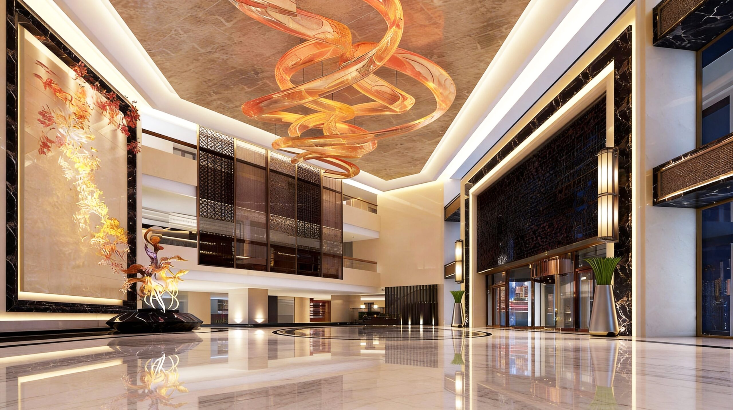 We customized copper grille screens and supporting copper decorations for Yancheng Mingcheng Jinjiang Grand Hotel. Taking classical Ming-style textures as the design elements, we adopted our proprietary warm brown copper coloring technology to create metal decorations that integrate oriental charm with modern textures. These decorations not only define spatial layers but also allow a consistent aesthetic symbol to run through the entire hotel.